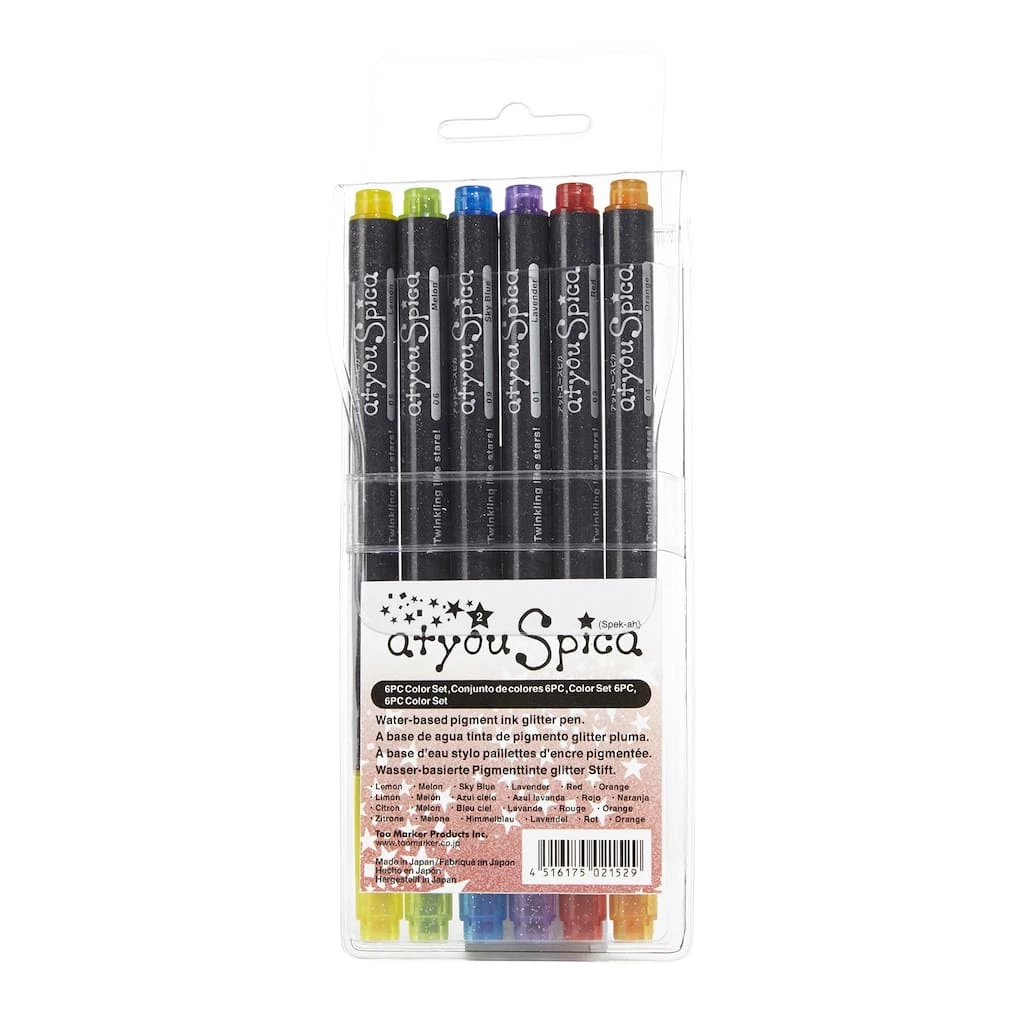 Copic Atyou Spica glitter pens contain archival, pigment-based ink and micro-glass flakes that make them more reflective and brilliant than the glass beads typically used other glitter pens. With a no-clog tip this pen will write shimmering color for over 360 yards, twice the length of other writing pens. The transparent pigment can be layered over other inks to add extra color and luster. It is ideal for adding sparkle to scrapbooks, journals, art and craft projects and more. Set colors include Lemon, Melon, Sky Blue, Lavender, Red, and Orange.