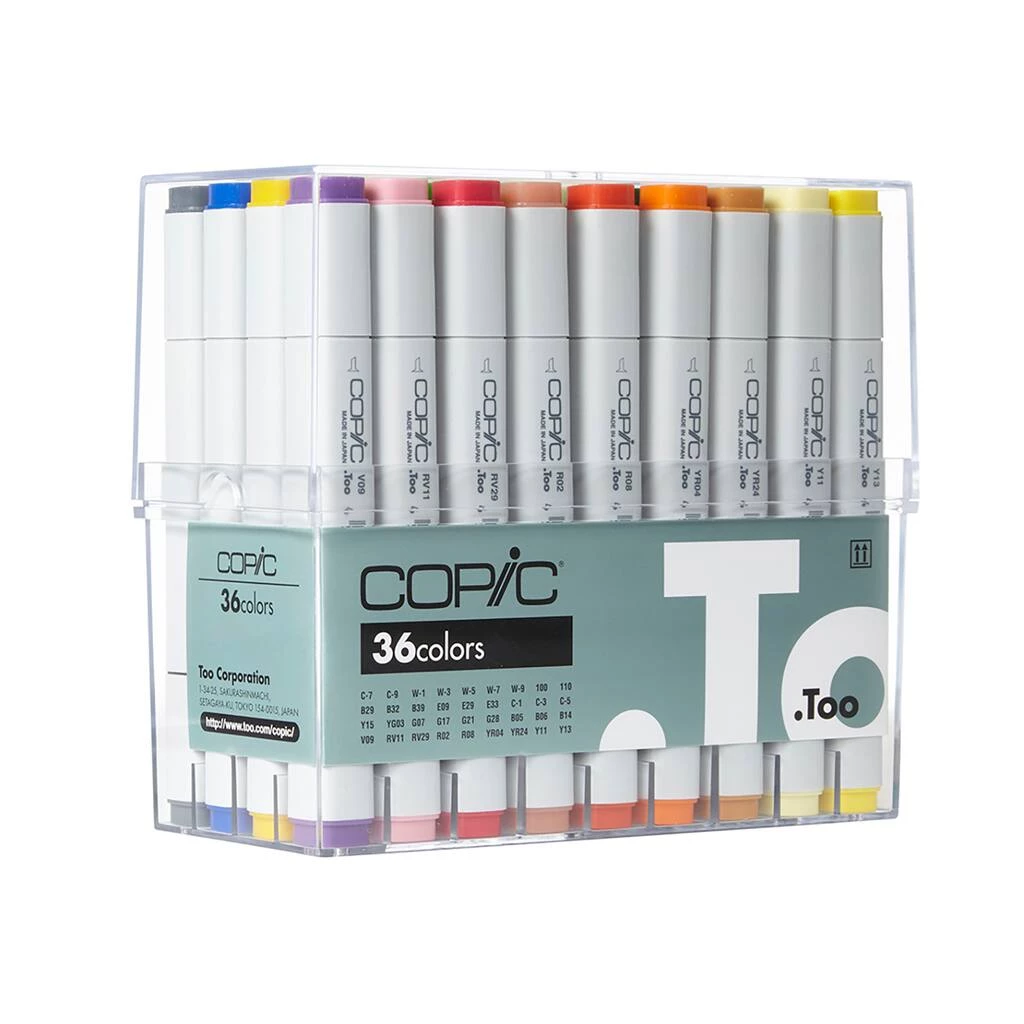 Packaged in a clear plastic case, this 36 color Basics set is the ideal way to begin or add to your marker collection. The original COPIC marker is ideal for calligraphy, airbrushing and graphic arts applications. The square, rounded-edge barrel features a broad nib on one end offering smooth, consistent coverage for large areas, while the fine nib on the other end allows for easy detail work. Set colors include: C7, C9, W1, W3, W5, W7, W9, 100, 110, B29, B32, B39, E09, E29, E33, C1, C3, C5, Y15, YG03, G07, G17, G21, G28, B05, B06, B14, V09, RV11, RV29, R02, R08, YR04, YR24, Y11 and Y13.