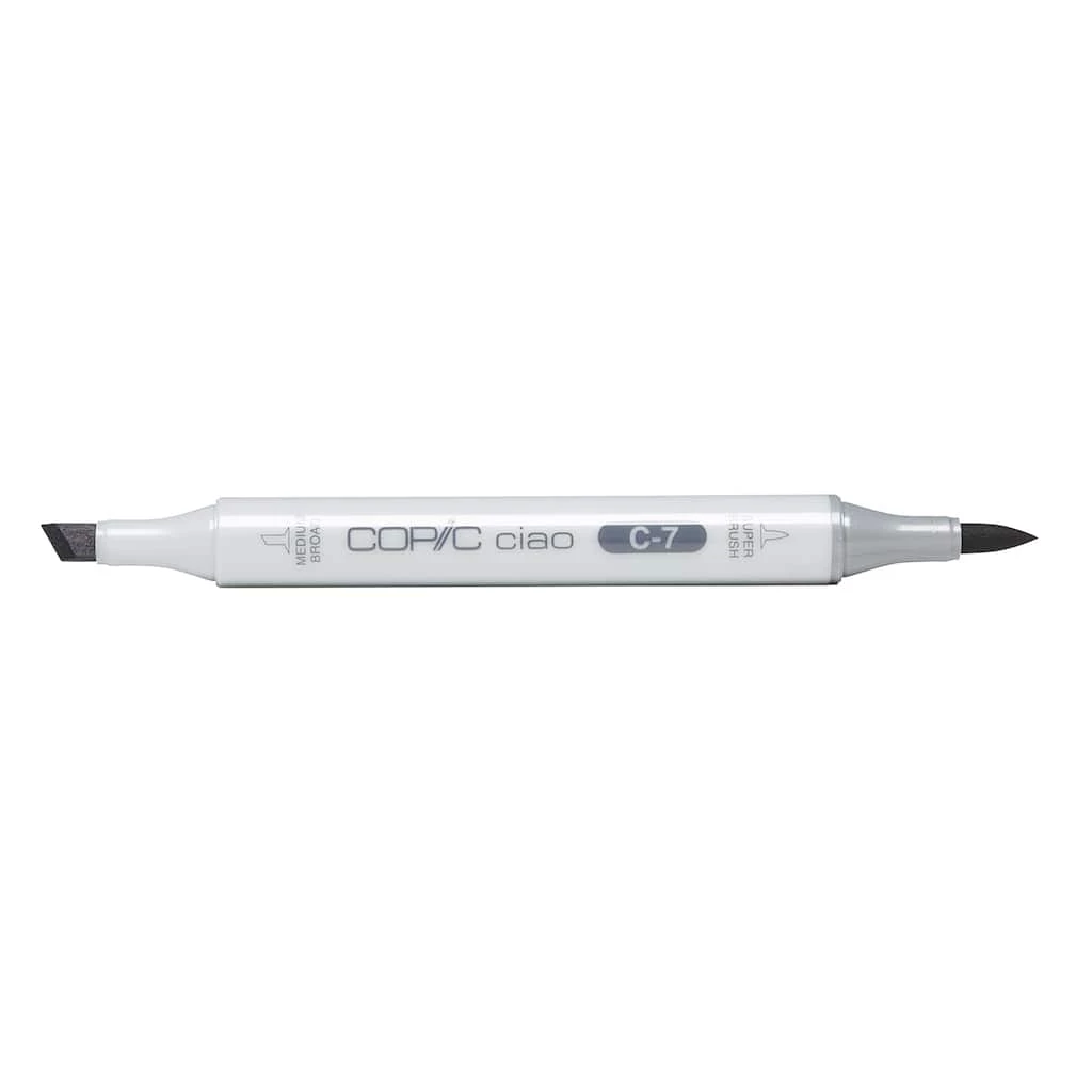 Copic Ciao markers are versatile double-ended refillable markers with fast-drying, permanent, nontoxic ink. Ciao are the perfect markers for beginners. They have the same ease of use and special features of the COPIC Sketch marker, with a super brush nib and a medium broad nib, yet it has a round barrel and comes in a convenient small size that makes it perfect for young artists. Both nibs are replaceable.
