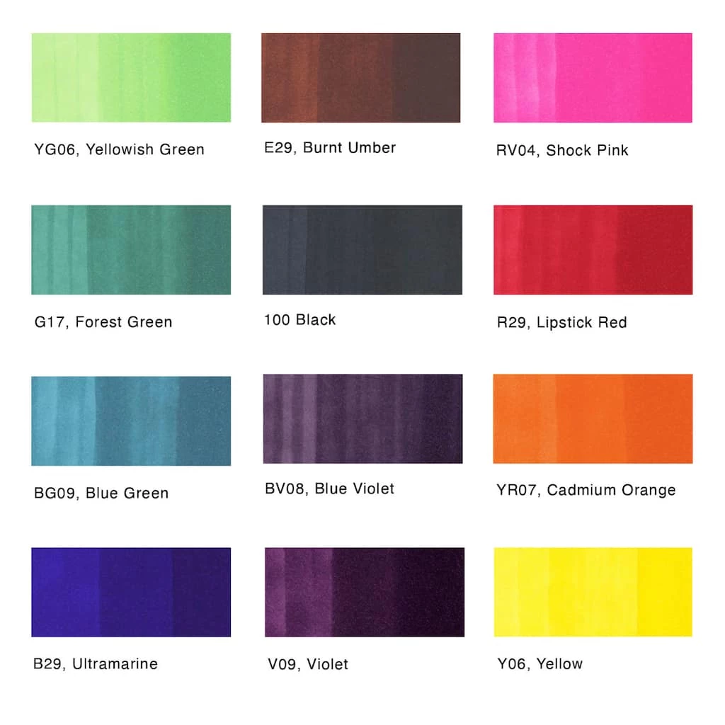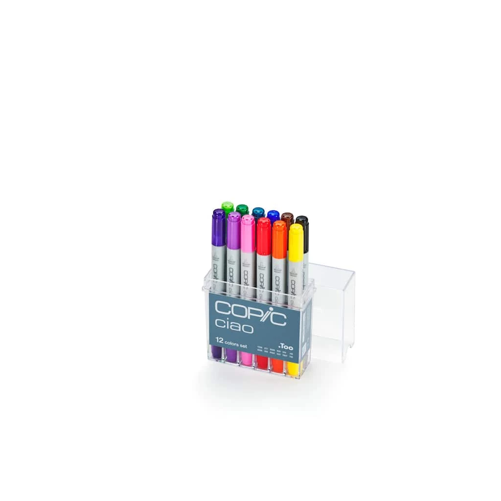 These Copic Ciao markers are versatile double-ended refillable markers with fast-drying ink. Ciao is a perfect marker for beginners. In addition to the super brush tip and a medium broad tip combo, the barrel is a slightly smaller size, making the it fun and easy for young artists to use. Colors included are YG06, BV08, G17, V09, BG09, RV04, B29, R29, E29, YR07, 100, Y06.