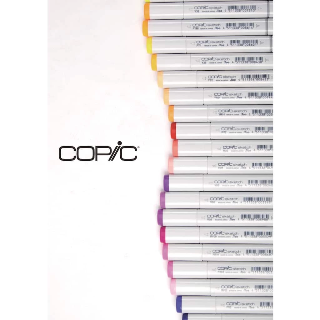 COPIC markers are versatile double-ended refillable markers with fast-drying, permanent nontoxic ink. The original Copic Marker is ideal for calligraphy, airbrushing and graphic arts applications. The square, rounded-edge barrel features a broad nib on one end offering smooth, consistent coverage for large areas, while the fine nib on the other end allows for easy detail work. Both nibs are replaceable. This set contains W0, W2, W4, W6, W8, W10, T0, T1, T2, T3, T4, T5, T6, T7, T8, T9, T10, 100, C0, C2, C4, C6, C8, C10, N0, N1, N2, N3, N4, N5, N6, N7, N8, N9, N10, 110, BG13, BG99, B00, B01, B02, B04, E04, E07, E11, E13, E15, E19, E25, E27, E31, E34, E40, E49, BV00, V04, RV06, RV14, R17, R20, R29, R35, Y00, Y02, Y17, YG01, YG17, G02, G16, G29, BG02, and BG05.