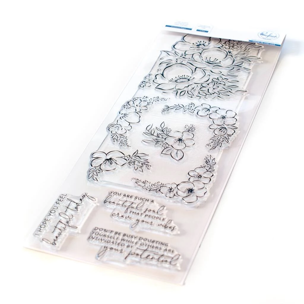 This innovative stamp includes all the floral elements on one stamp. Stamp these beautiful outline florals in all the different ink choices, including detail black, fadeout ink and heat embossing. Then color them with your favorite medium, or use them as just the outline for a modern feel. The florals are perfect for all types of coloring; including watercolor, alcohol & brush markers, colored pencils and no-line coloring. Finish your card off with an uplifting sentiment from this gorgeous slimline sized stamp set!