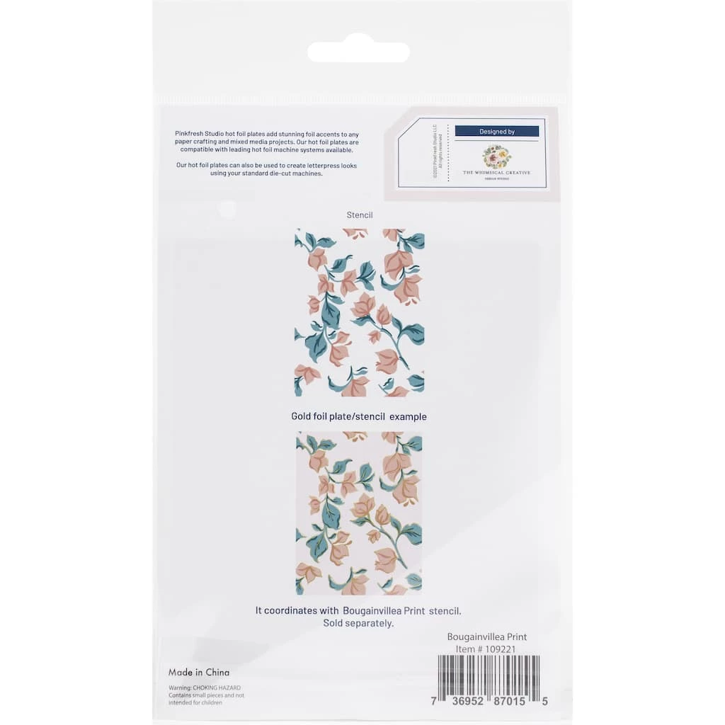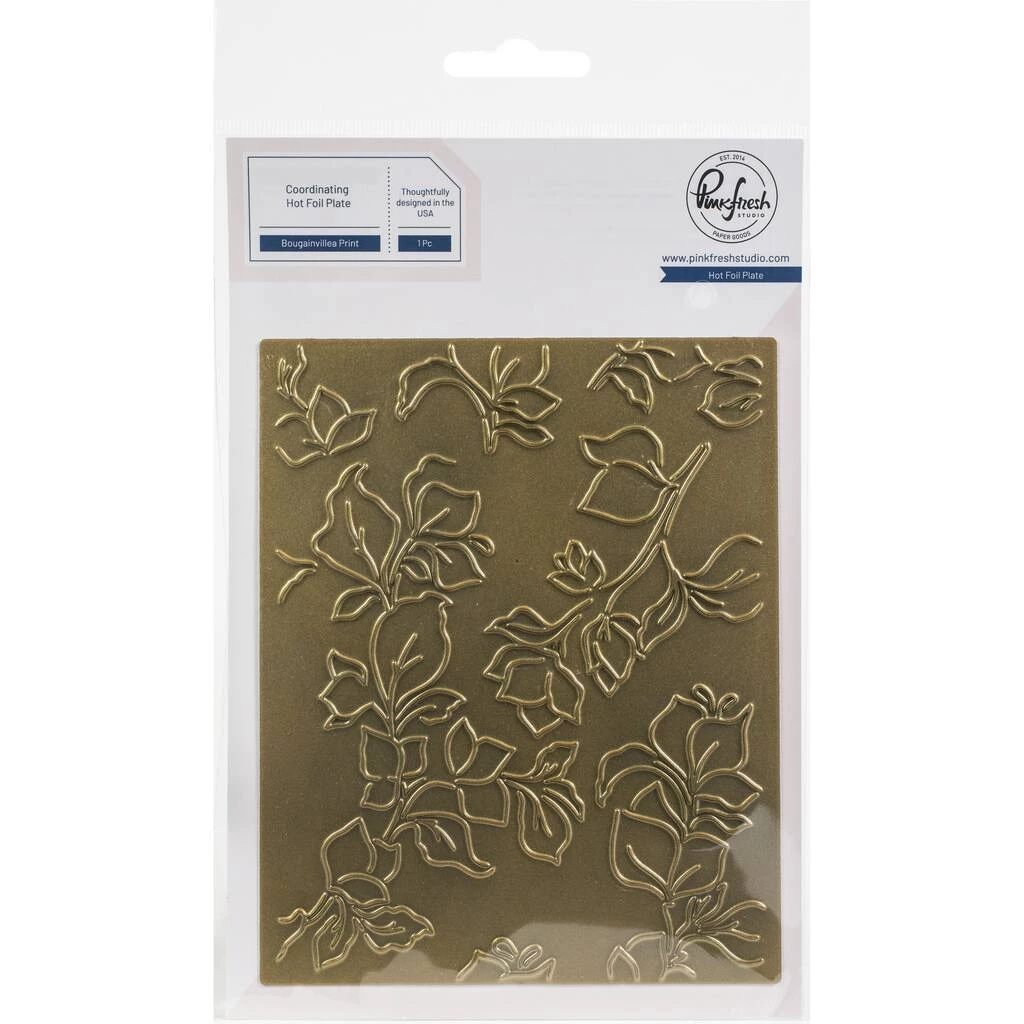 This hot foil plate coordinates with the Bougainvillea Print layering stencil set. Add a stunning, letterpress feel to all your projects with Pinkfresh’s new hot foil plates! Designed to work in any standard hot foil system, be sure to follow the instructions in your manual for a standard hot foil plate. Once foiled, the flowers are perfect for all types of coloring, including watercolor, alcohol and brush markers, colored pencils and no-line coloring. Combine with the coordinating Bougainvillea Print layering stencil set to ink blend the images with all 48 shades of Pinkfresh Studio’s premium dye inks.
