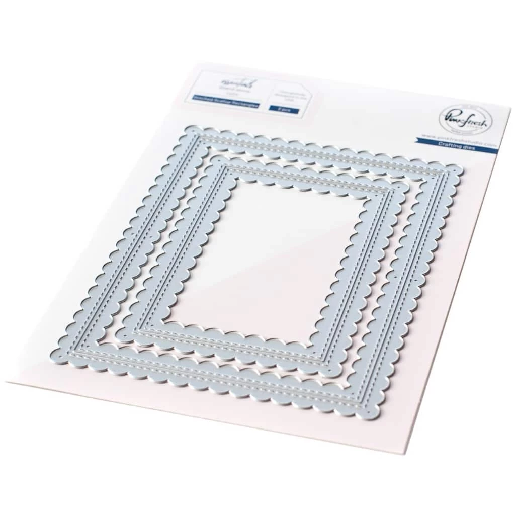 This two piece die set was designed as an essential for crafting basics. Cut panels and layers fit perfectly on an A2 card with a beautiful stitched scallop edge. Each die includes an outer scallop edge, but also includes an inverted scallop inner die. With straight lines and perfect edges that only a metal die can give, you will reach for these dies time and time again! Combine the scallop and inverted scallop cuts to create a beautiful frame, perfect for shaker elements, framing a favorite photo or add as a layering piece to your card.
