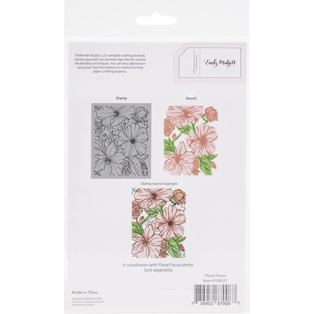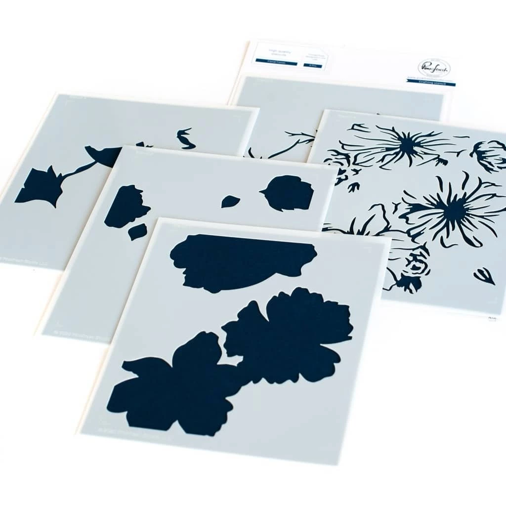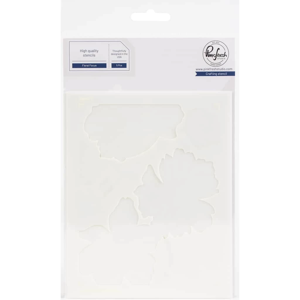This 5-piece layering stencil set made to coordinate with the Floral Focus cling stamp. Use them without the stamped or foiled image for a soft, ink blended folk floral background. Use the cling stamp to add more detail to the image by stamping in detail black, or heat embossing in gold.