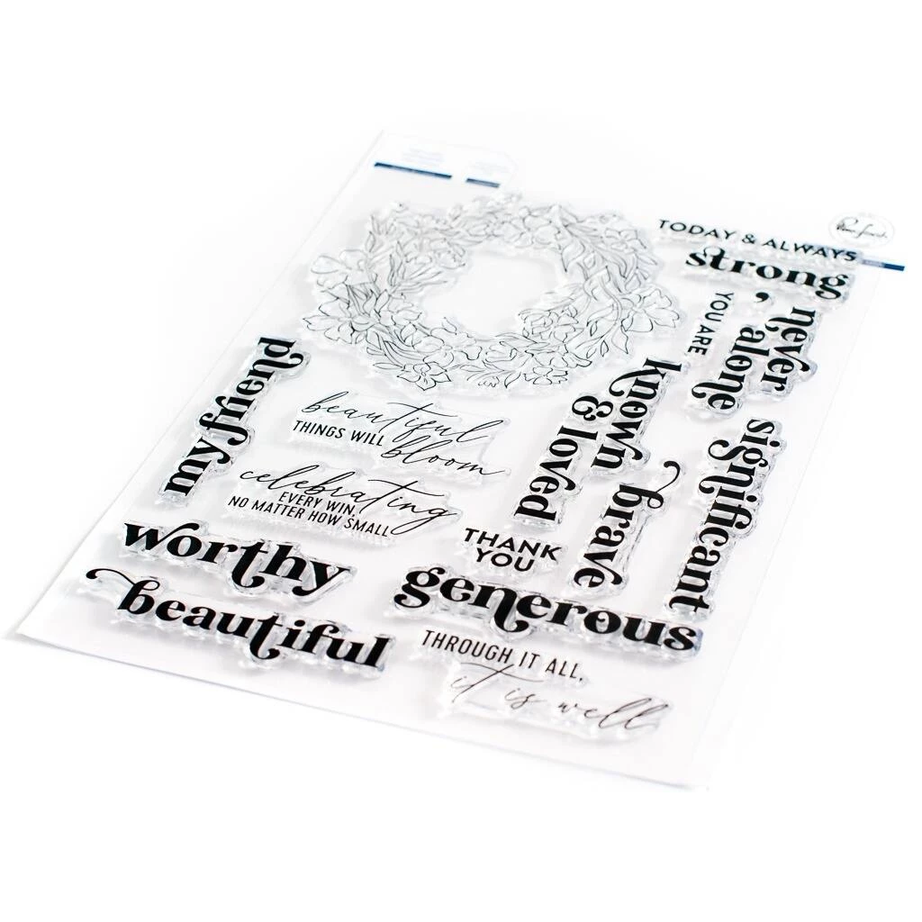 This stamp set includes a gorgeous wreath, and bold, heartfelt sentiments. Easily ink blend colors to the wreath with the coordinating set of stencils, or color them with your favorite medium. They are perfect for using with liquid watercolor, colored pencils, markers and more.