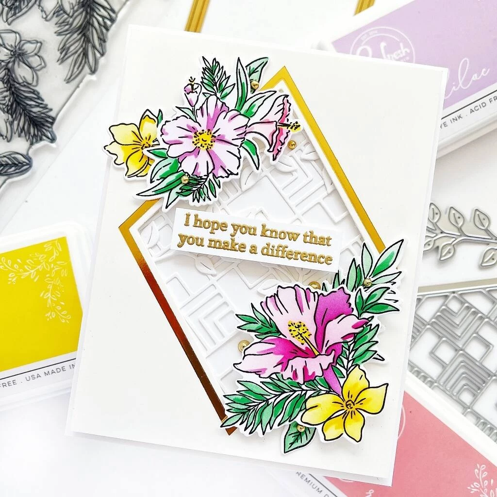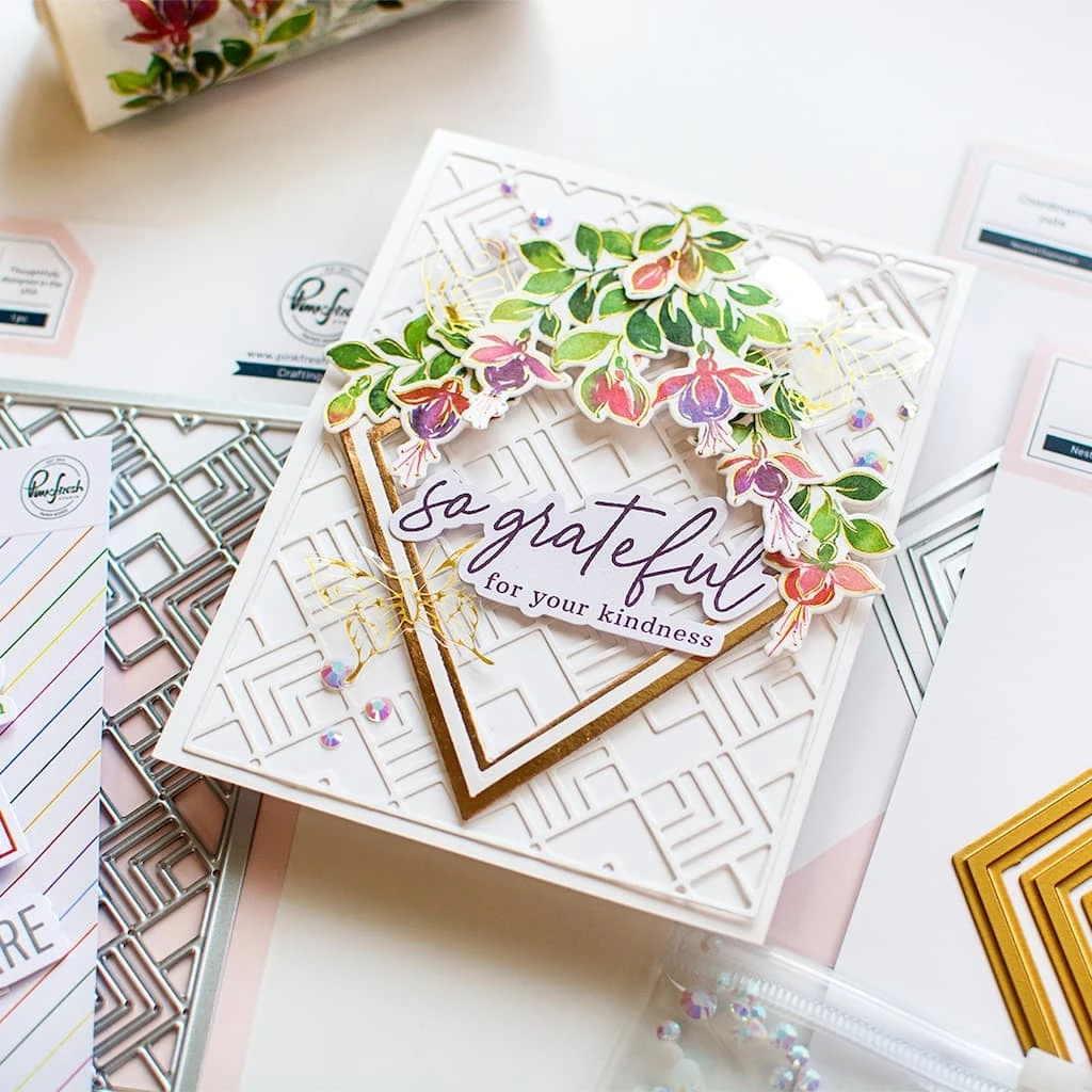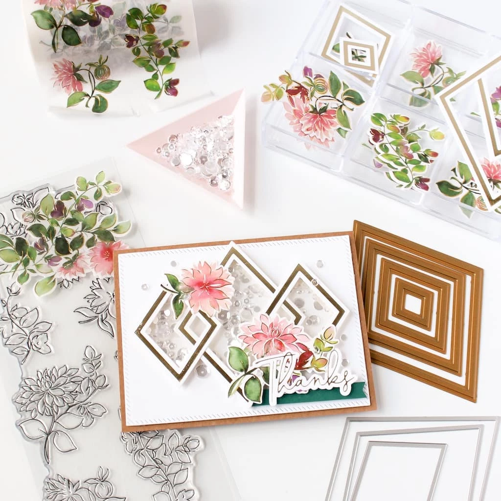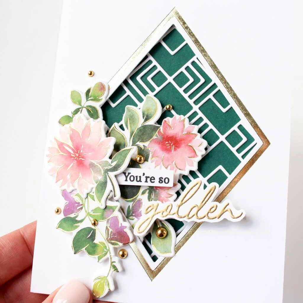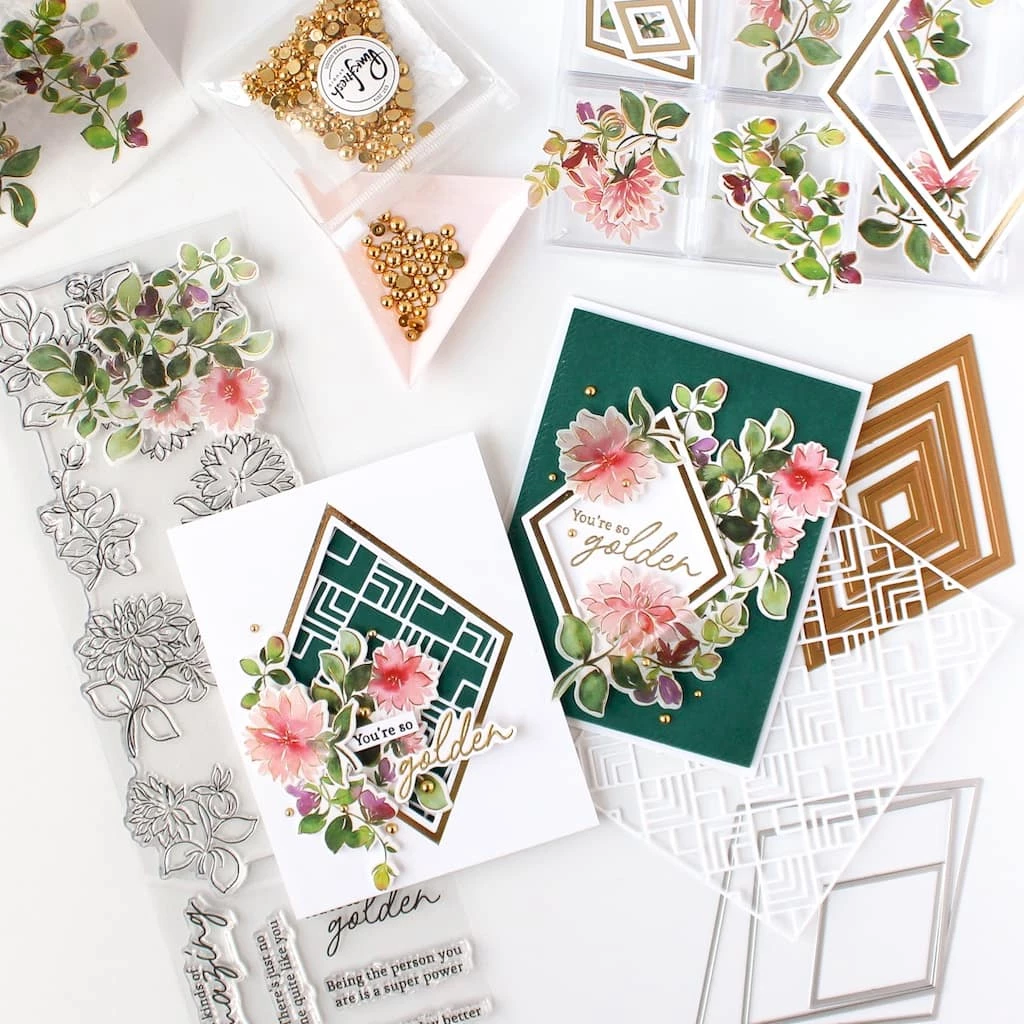 This four-piece hot foil plate set was designed by Inna Moreva, and made to coordinate with the Nested Diamonds die set. These nested hot foil shapes will become an essential for any crafter’s foiling system! Use just one diamond to create a shaped panel or frame, or hot foil them together to add a modern geometric design to your background. The options are endless with this versatile and innovative nested hot foil set!