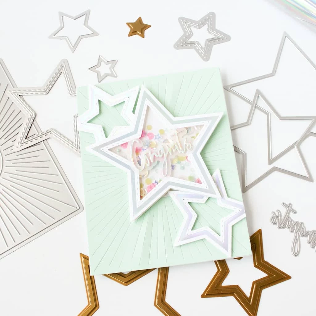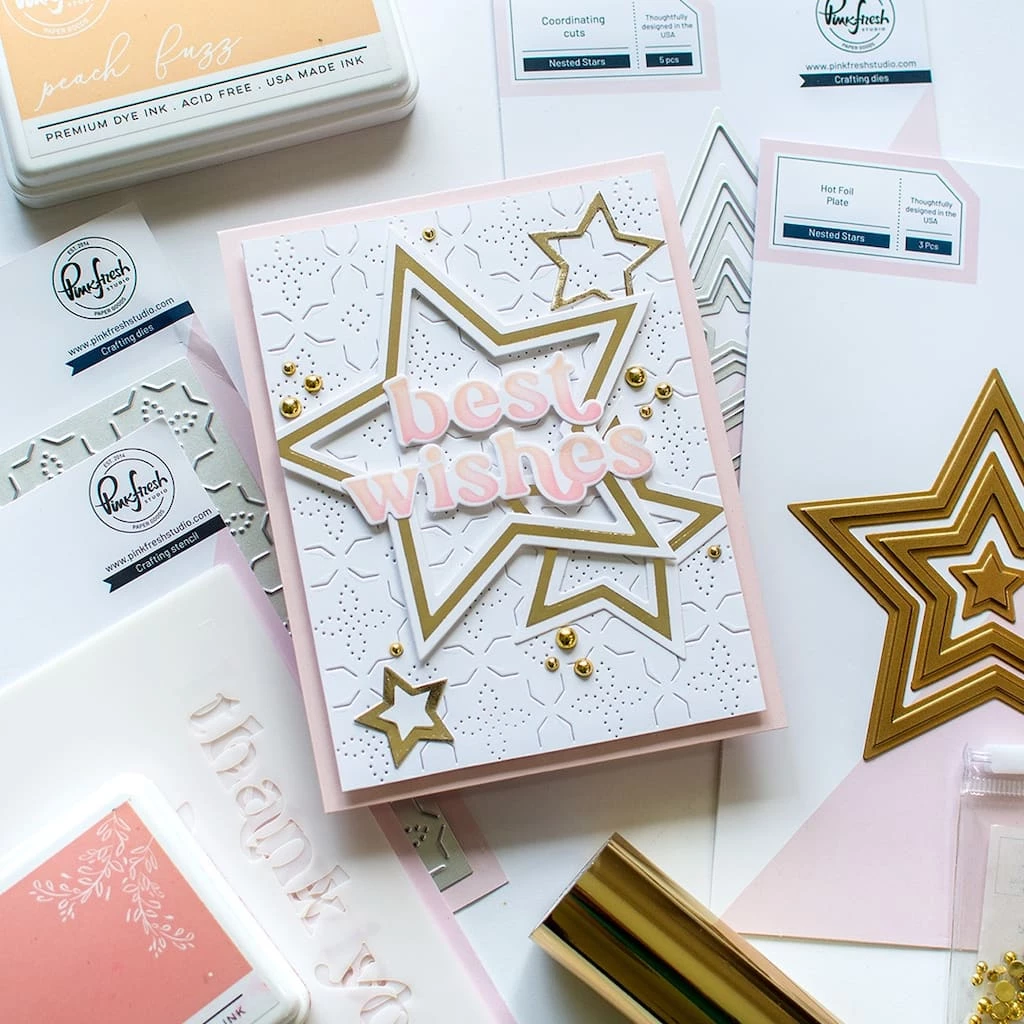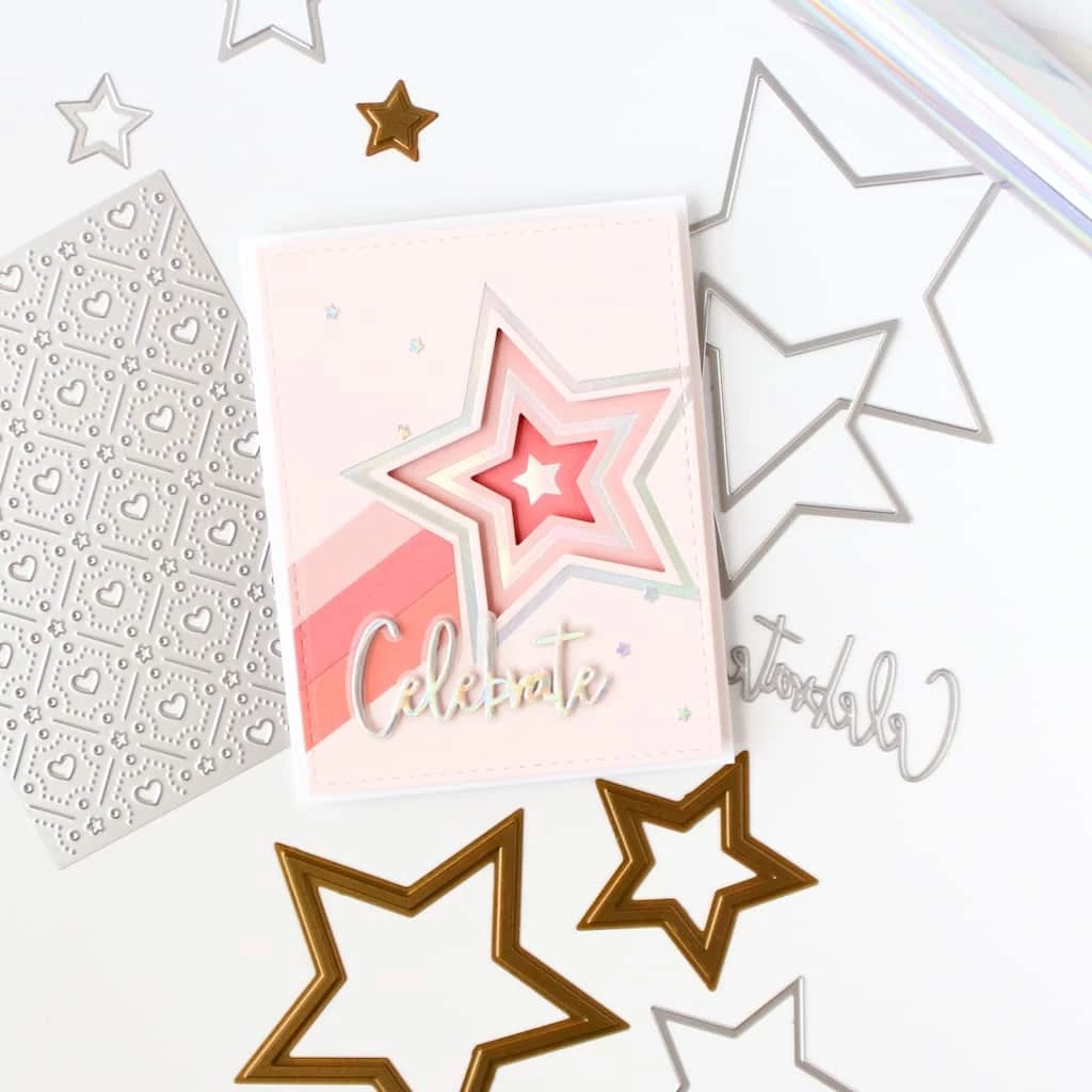 This three-piece hot foil plate set was designed by Inna Moreva, and made to coordinate with the Nested Stars die set. These nested hot foil shapes will become an essential for any crafter’s foiling system! Use just one star to create a shaped panel or frame, or hot foil them together to add a modern geometric design to your background. The options are endless with this versatile and innovative nested hot foil set!