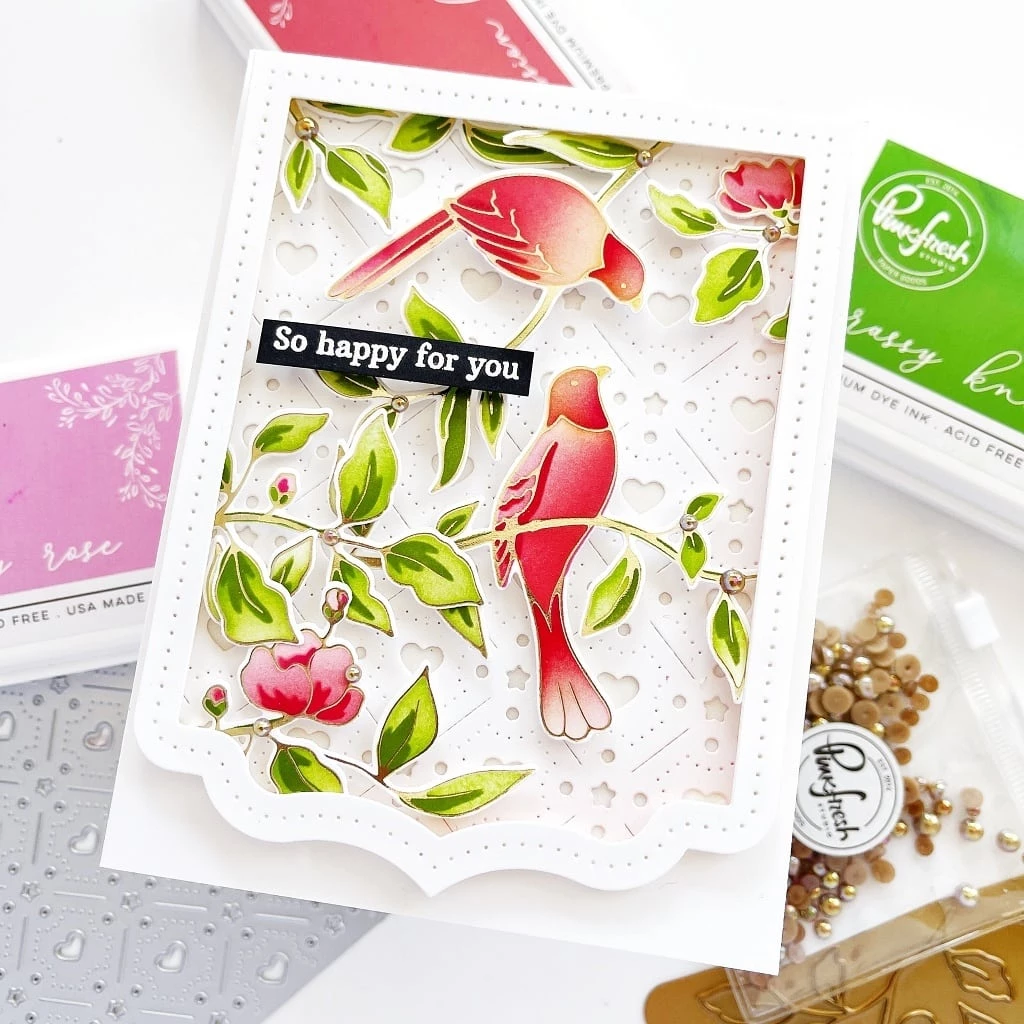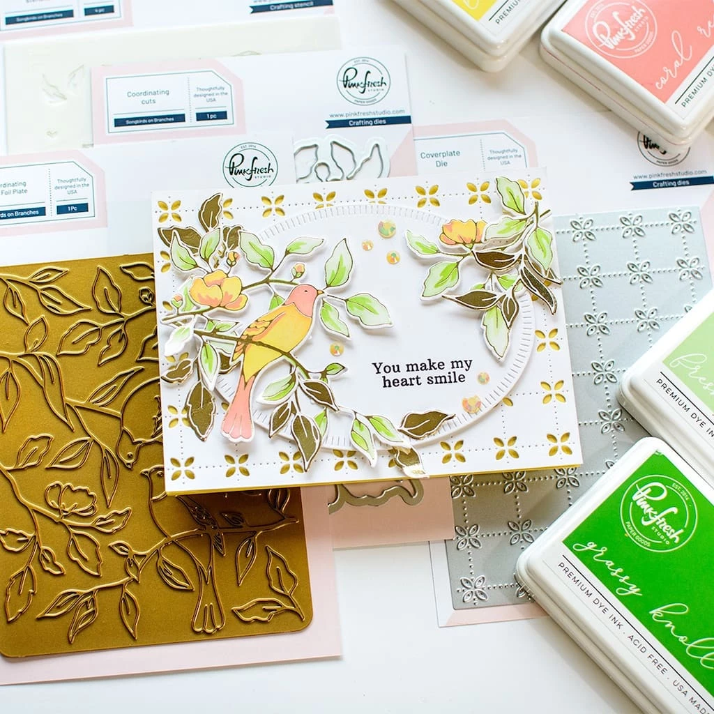 This one-piece hot foil plate coordinates with the Songbirds on Branches layering stencil set and Songbirds on Branches die. There is also a matching Songbirds on Branches stamp set (sold separately). Create a stunning, letterpress feel to all your projects with a Pinkfresh feel using our beautiful hot foil plates! Designed to work in any standard hot foil system, be sure to follow the instructions in your manual for a standard hot foil plate. Once foiled, the birds and branches are perfect for all types of coloring, including watercolor, alcohol and brush markers, colored pencils and no-line coloring. Use the coordinating Songbirds on Branches die to cut out all the images in one easy pass through your die-cut machine.