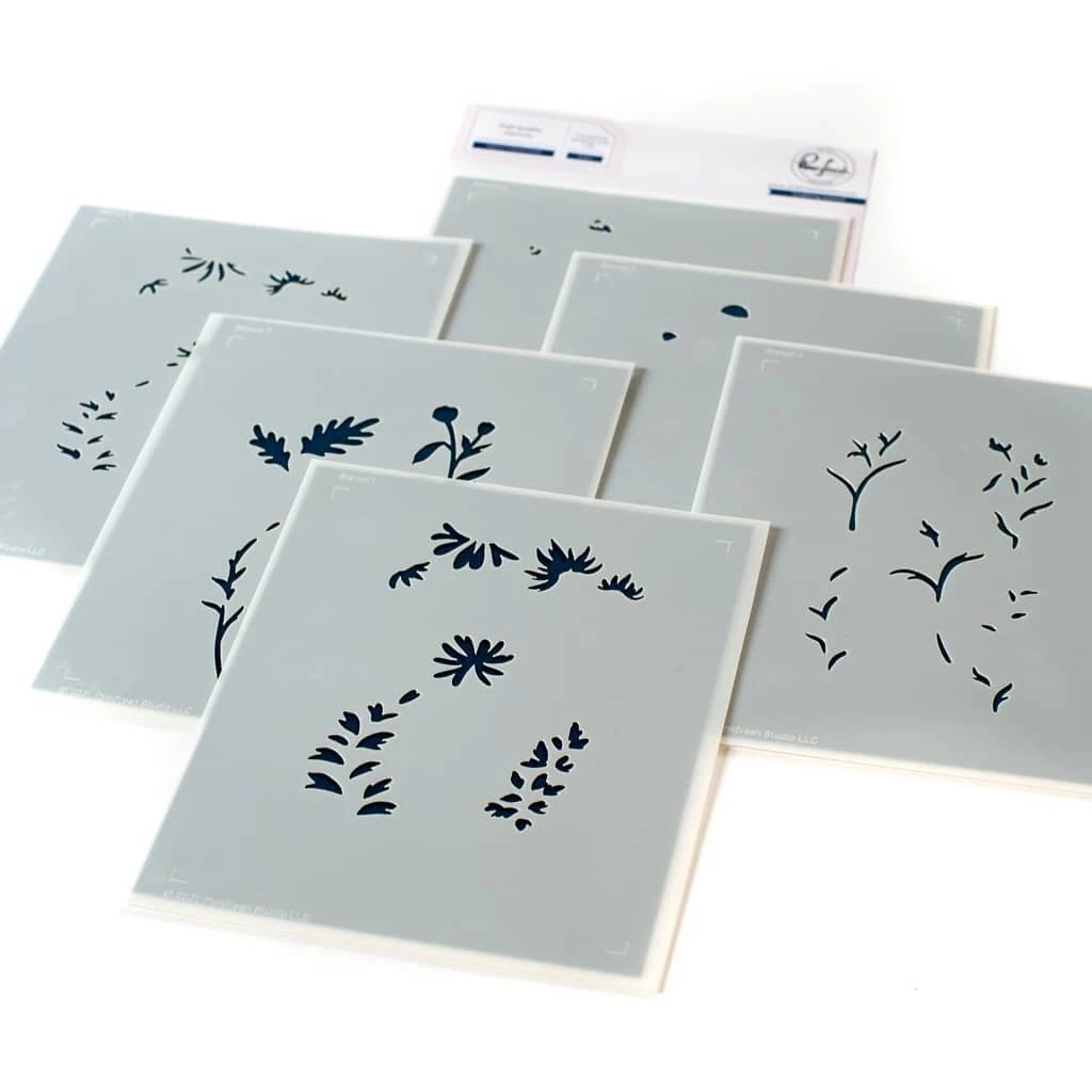 Create gorgeous floral designs with this layering stencil set. There is a separate stencil for each layer, with guidelines on each stencil for perfect alignment every time. Use them without the stamped image for a soft, no-line coloring feel. Use the coordinating stamp or hot foil plate to add more detail to the image by stamping in detail black, or hot foiling in gold.