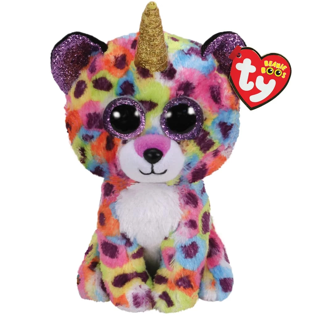 Vibrant colored fur and a sparkling horn make this Beanie Boos leopard a sheer treat to the eyes. Giselle is the perfect combination of mischief and nice, making her a fun must-have for your Beanie collection.
